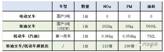 柴油叉车与汽油机动车、电动叉车年排放对比