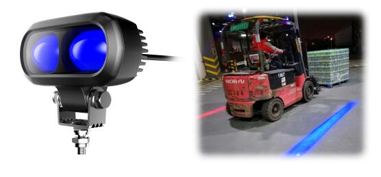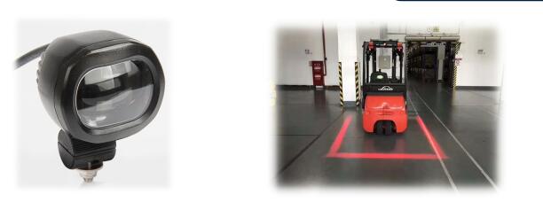 警示灯工作原理是通过投影一个高亮度的光线束图案到叉车行驶的路面上,起到一个视觉警示的作用。尤其是在嘈杂的工作环境中当声音警示无法发挥很好的作用时,行人警示灯将发挥重要的作用,另外当叉车即将通过十字路口这样的盲区地段的时候,警示灯也起到很好的提示作用。