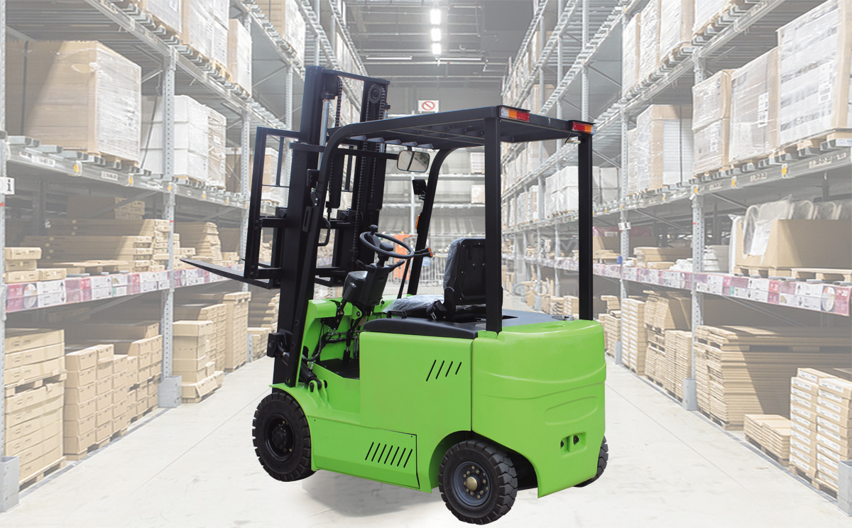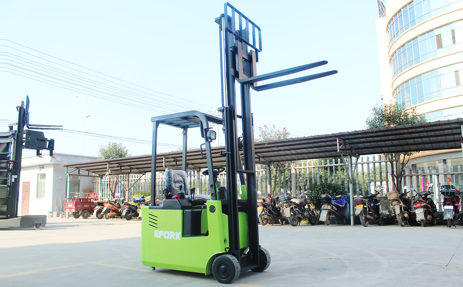 考虑到叉车作业通道的宽度,在不能采购高成本的前移式叉车的情况下,还要考虑是选择三轮还是四轮,三轮电动叉车例如三支点平衡重叉车(如下图),它的转弯半径相比四轮平衡重叉车要小得多;